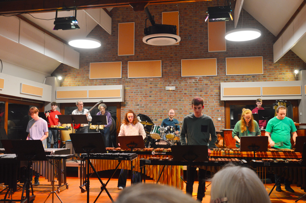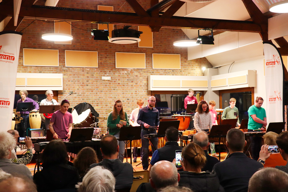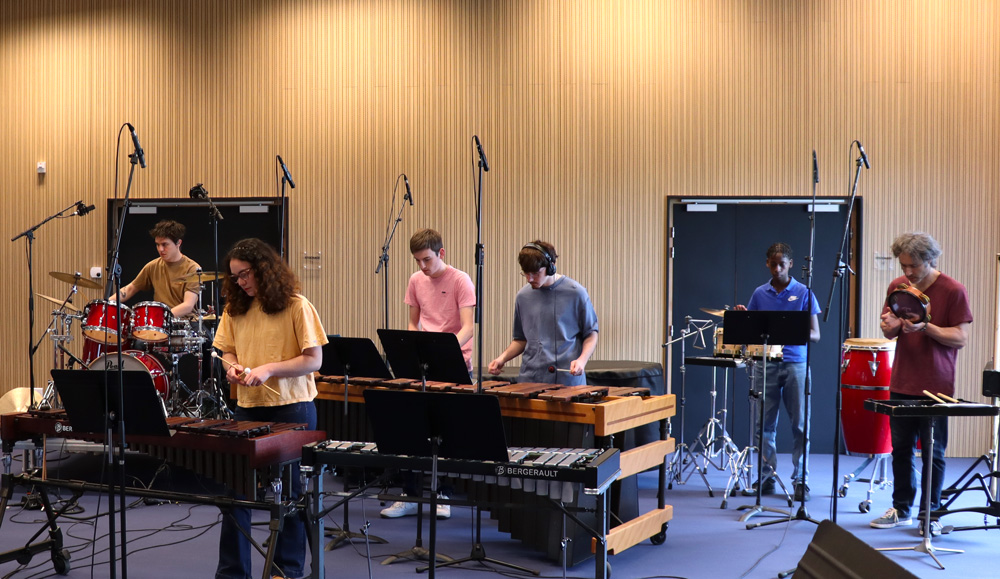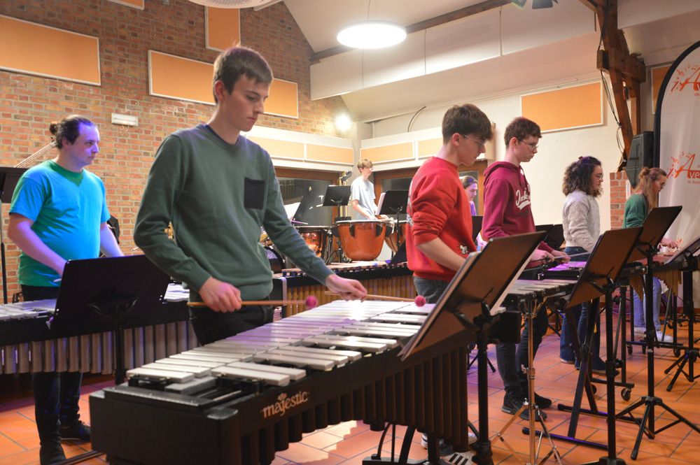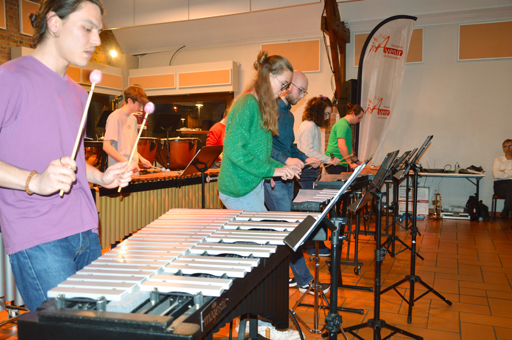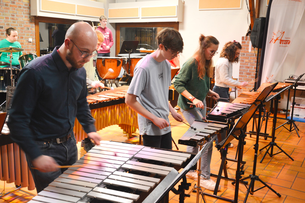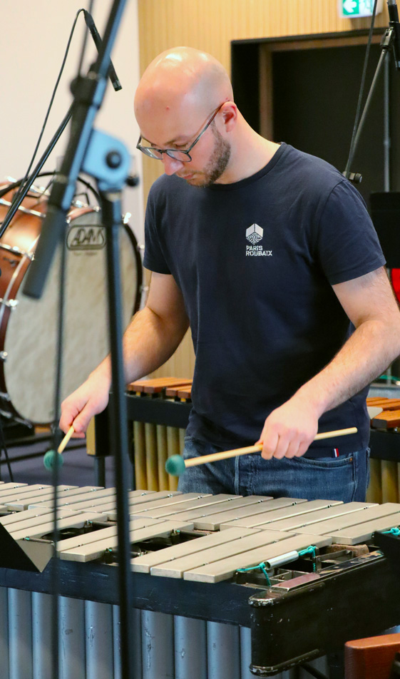 Une dizaine de percussionnistes qui assènent coups de baguettes, de mailloches et coups de marteaux sur tous types d’instruments à percussions.