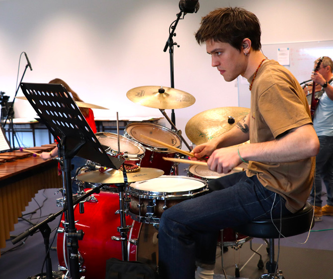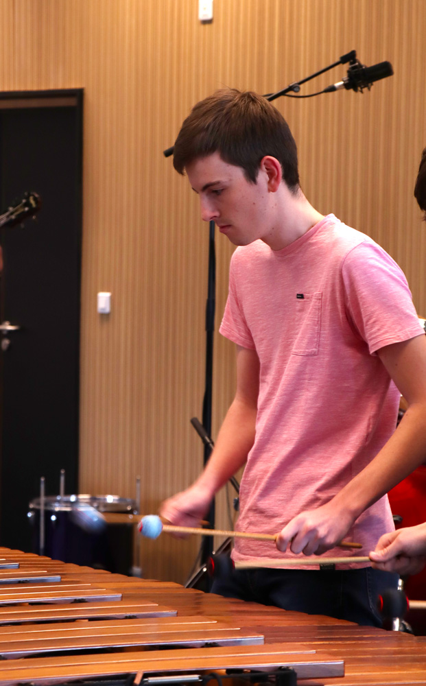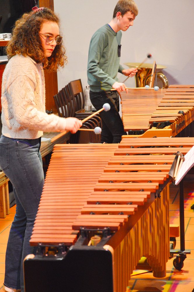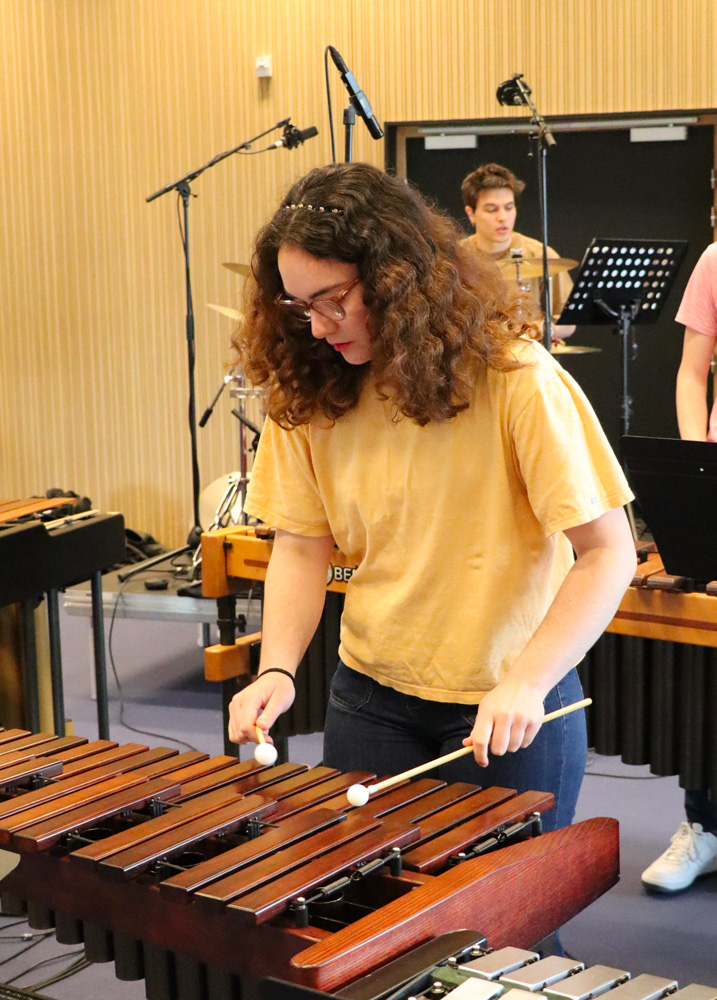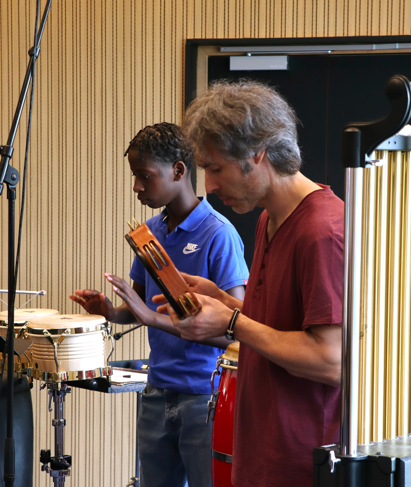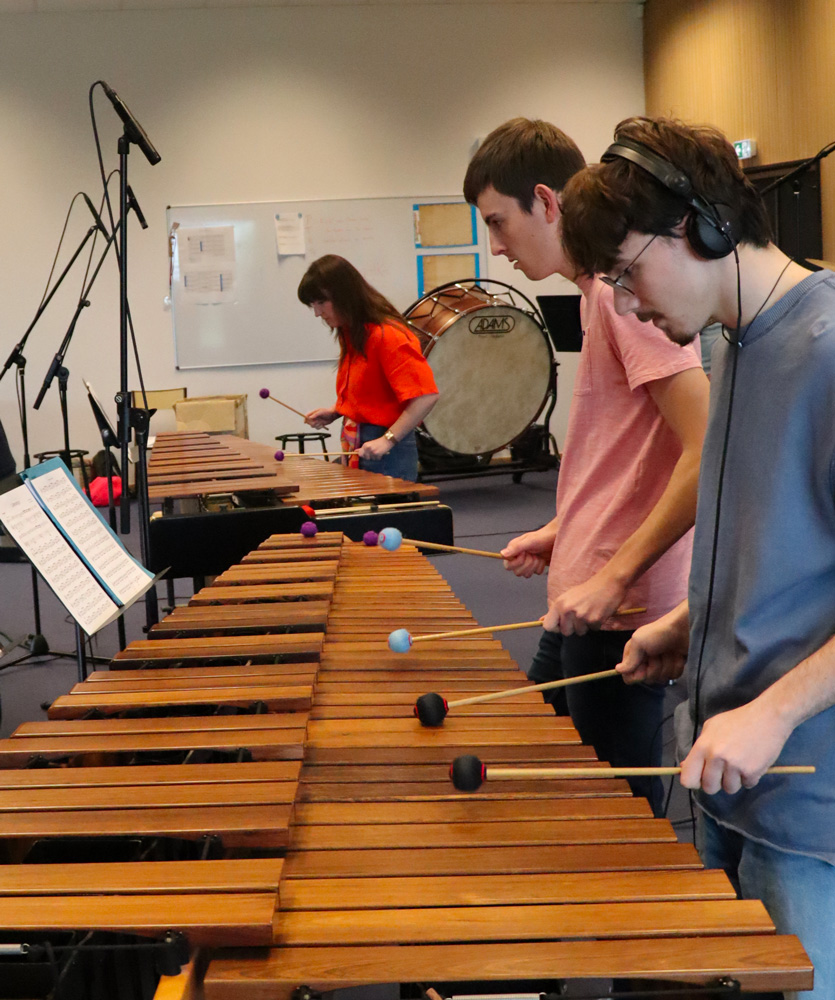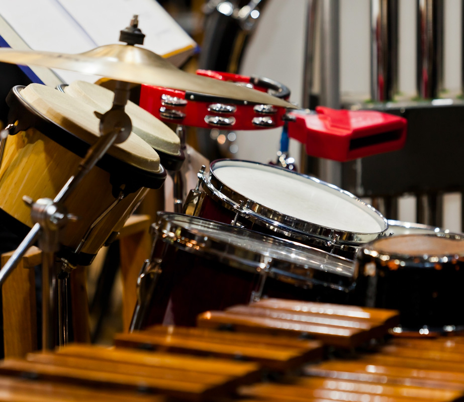 Une dizaine de percussionnistes qui assènent coups de baguettes, de mailloches et coups de marteaux sur tous types d’instruments à percussions.