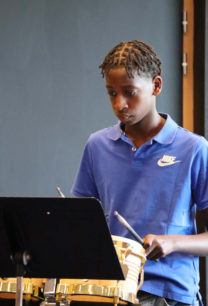 Une dizaine de percussionnistes qui assènent coups de baguettes, de mailloches et coups de marteaux sur tous types d’instruments à percussions.